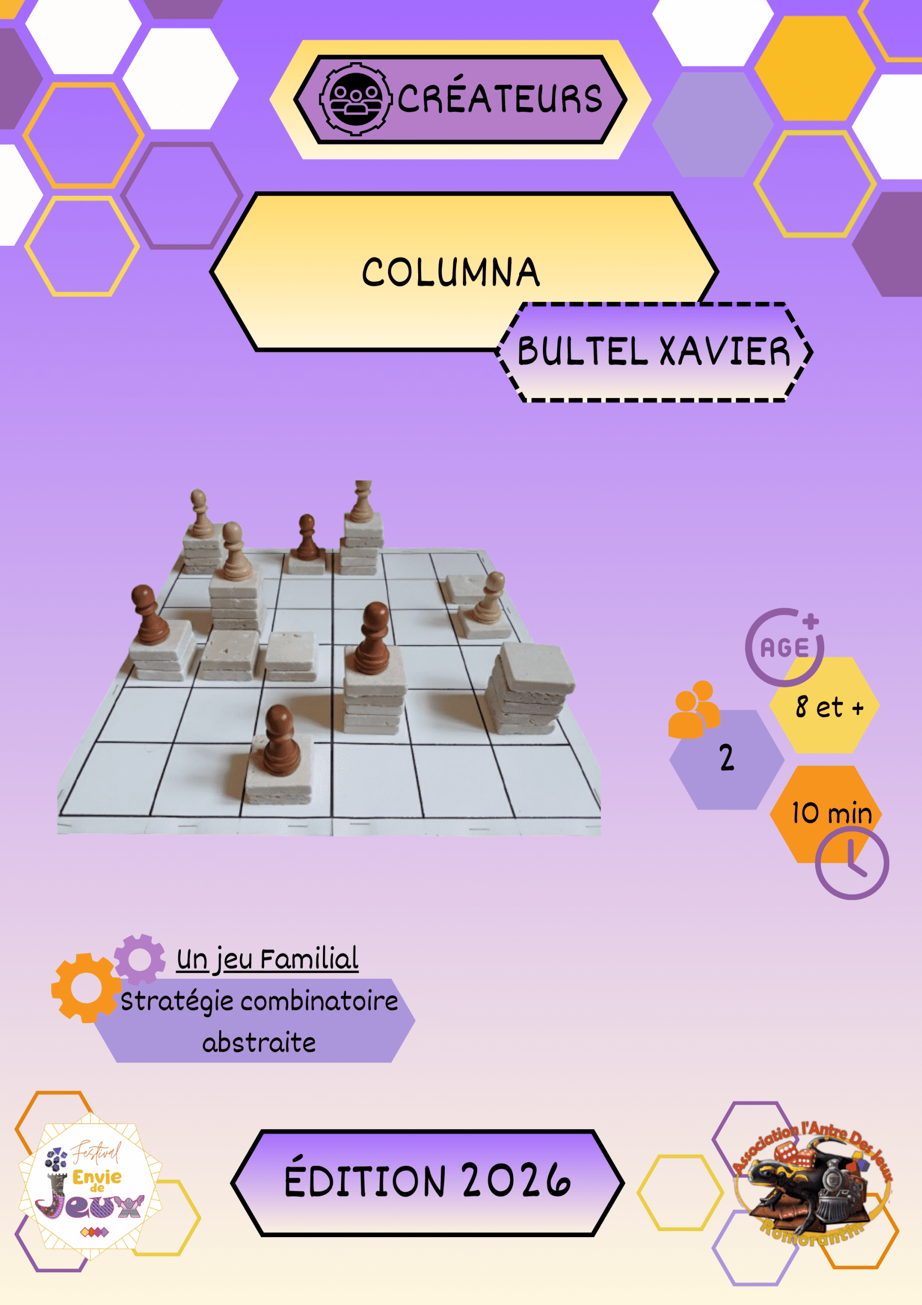 Empilez et dominez ! Avec Columna, construisez des piliers avec votre adversaire, puis prenez en le contrôle grâce à vos pions. Les règles sont simples et s’apprennent en cinq minutes, mais chaque partie révèle une profondeur stratégique qui mettra vos talents de tacticien à l’épreuve.