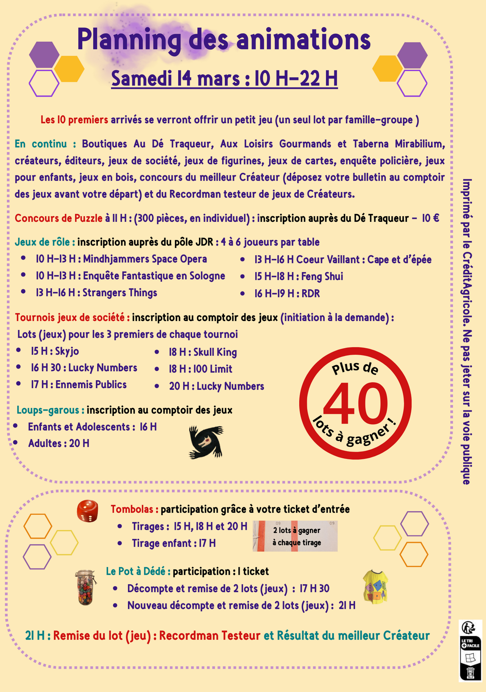À votre arrivée, rendez-vous à notre comptoir de jeux où notre équipe de bénévoles sera présente pour vous accueillir. Ils se feront un plaisir de vous aider à choisir un jeu qui correspond à vos préférences, que vous soyez un joueur expérimenté ou un débutant curieux de découvrir de nouveaux univers ludiques.