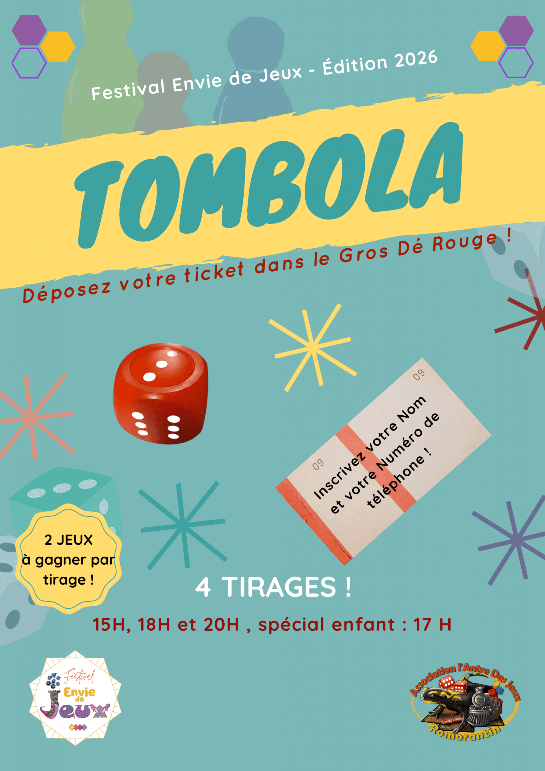 Votre ticket d’entrée vous permet de participer à 3 tombolas, tirages à 14h, 18h et 21h et une tombola enfants tirage à 17h